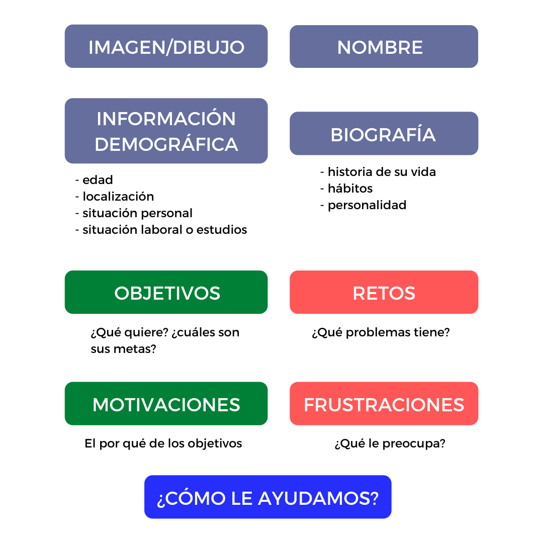 El siguiente paso sería diseñar el Buyer Persona, completando cada apartado con lo recopilado en el paso anterior. Es recomendable construir el Buyer Persona mediante una o más sesiones de Design Thinking con varias personas del equipo, así será más productivo y completo. No hay una estructura de Buyer Persona fija, ya que se puede detallar en mayor o menor medida, pero lo que se incluya siempre debe ser relevante para tu negocio o proyecto en concreto. Como mínimo deberían incluirse: