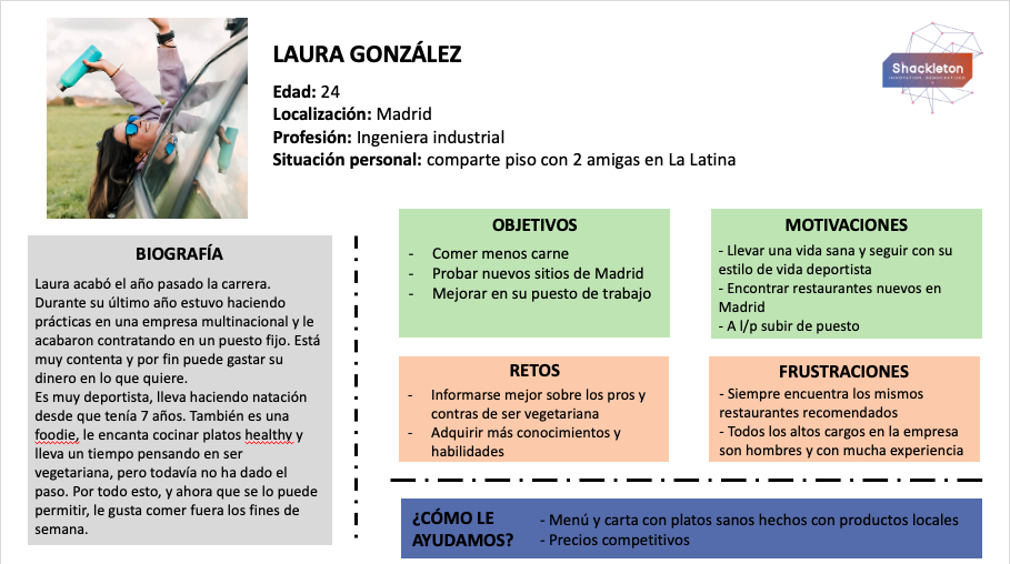 Como ya hemos mencionado, tendrás que tener en cuenta lo que quieres saber sobre tus clientes. Por ejemplo, si tu proyecto es digital sería buena idea incluir cuáles son sus hábitos digitales o qué redes sociales utiliza. Otras variables que pueden ser interesantes son: un lema o slogan de la persona, drivers de compra, barreras de entrada, medios (RRSS) que consume, habilidades, herramientas que utiliza en su trabajo, hábitos de compra, relación con el producto/servicio… A continuación, te dejamos un ejemplo para visualizarlo mejor. Hemos diseñado un Buyer Persona para un restaurante vegano de Madrid.